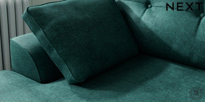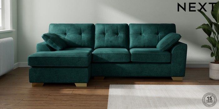 7.2.10 Buy Stamford Buttoned Back Medium Sofa Chaise - Left Hand Plush Chenille Dark Teal Green Large Square Angle - Brushed Brass from the Next UK online shop Click here to use our accessible website