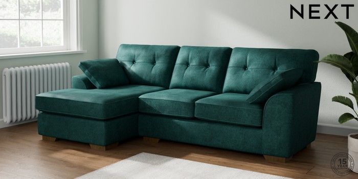 7.2.10 Buy Stamford Buttoned Back Medium Sofa Chaise - Left Hand Plush Chenille Dark Teal Green Large Square Angle - Mid from the Next UK online shop Click here to use our accessible website