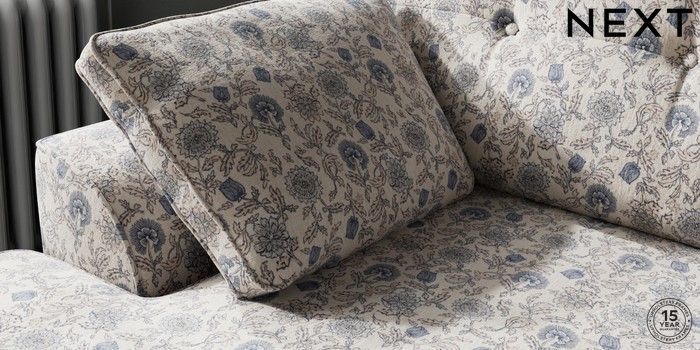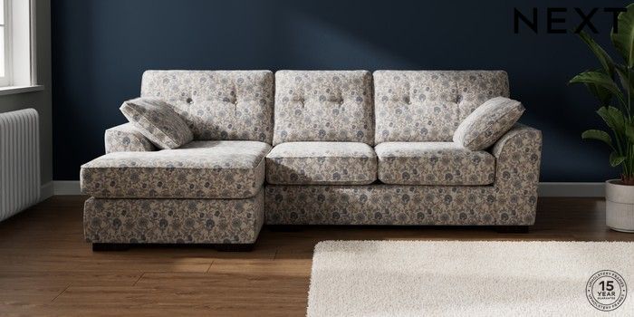7.3.1 Buy Stamford Buttoned Back Medium Sofa Chaise - Left Hand Relaxed Linen Look Print Woodblock Floral Blue Large Square Angle - Dark from the Next UK online shop Click here to use our accessible website