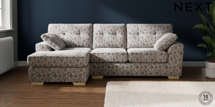 7.3.1 Buy Stamford Buttoned Back Medium Sofa Chaise - Left Hand Relaxed Linen Look Print Woodblock Floral Blue Large Square Angle - Light from the Next UK online shop Click here to use our accessible website