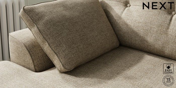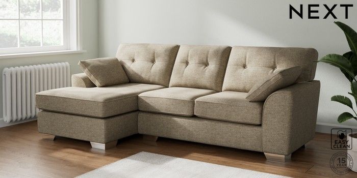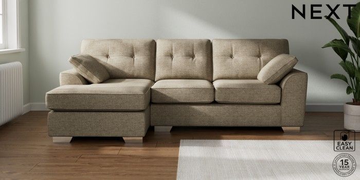 7.2.10 Buy Stamford Buttoned Back Medium Sofa Chaise - Left Hand Woven Chenille Easy Clean Mid Natural Large Square Angle - Chrome Metal from the Next UK online shop Click here to use our accessible website