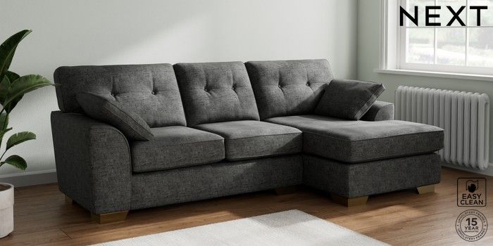 6.12.1 Buy Stamford Buttoned Back Medium Sofa Chaise - Right Hand Boucle Weave Easy Clean Charcoal Grey Large Square Angle - Brushed Brass from the Next UK online shop Click here to use our accessible website