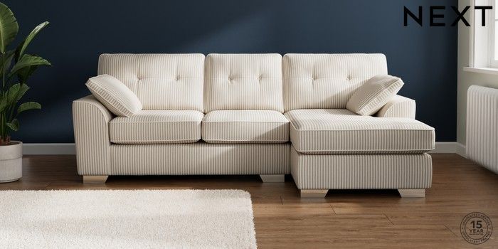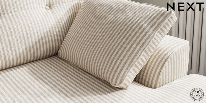 7.3.1 Buy Stamford Buttoned Back Medium Sofa Chaise - Right Hand Chenille Stripe Natural Large Square Angle - Chrome Metal from the Next UK online shop Click here to use our accessible website