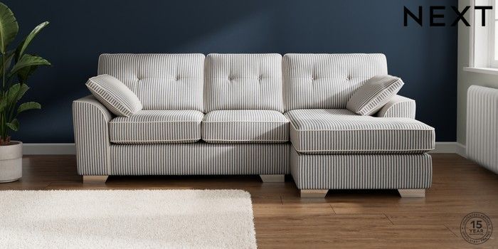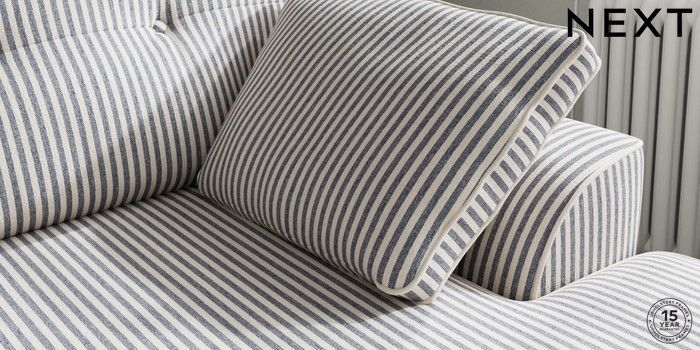 7.3.1 Buy Stamford Buttoned Back Medium Sofa Chaise - Right Hand Chenille Stripe Slate Blue Large Square Angle - Chrome Metal from the Next UK online shop Click here to use our accessible website