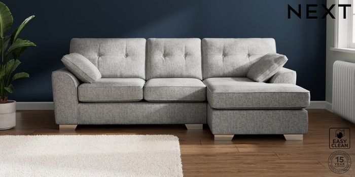 7.2.10 Buy Stamford Buttoned Back Medium Sofa Chaise - Right Hand Chunky Boucle Easy Clean Light Grey Large Square Angle - Chrome Metal from the Next UK online shop Click here to use our accessible website