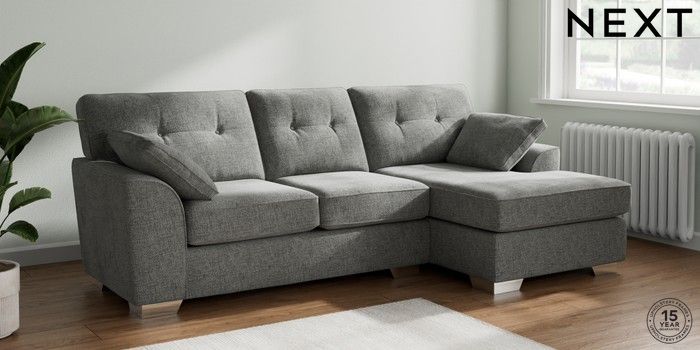 7.2.10 Buy Stamford Buttoned Back Medium Sofa Chaise - Right Hand Chunky Chenille Dark Grey Large Square Angle - Chrome Metal from the Next UK online shop Click here to use our accessible website