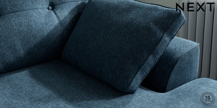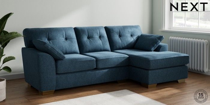 7.2.10 Buy Stamford Buttoned Back Medium Sofa Chaise - Right Hand Cotswold Chenille Dark Blue Large Square Angle - Brushed Brass from the Next UK online shop Click here to use our accessible website