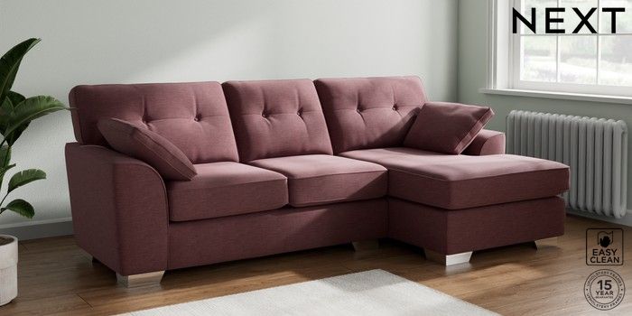 7.3.1 Buy Stamford Buttoned Back Medium Sofa Chaise - Right Hand Fine Chenille Easy Clean Mid Mulberry Purple Large Square Angle - Chrome Metal from the Next UK online shop Click here to use our accessible website