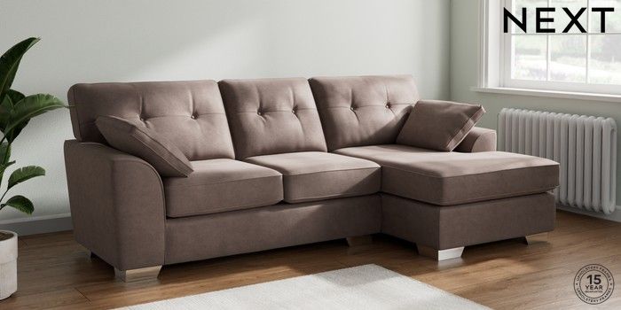 7.2.10 Buy Stamford Buttoned Back Medium Sofa Chaise - Right Hand Luxe Chenille Mink Brown Large Square Angle - Chrome Metal from the Next UK online shop Click here to use our accessible website