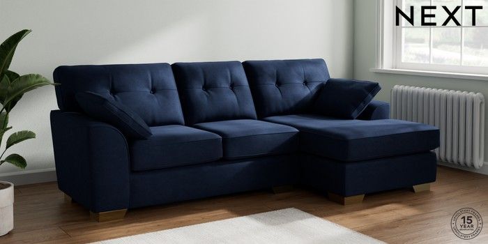 7.2.6 Buy Stamford Buttoned Back Medium Sofa Chaise - Right Hand Luxe Chenille Navy Blue Large Square Angle - Brushed Brass from the Next UK online shop Click here to use our accessible website