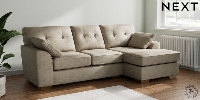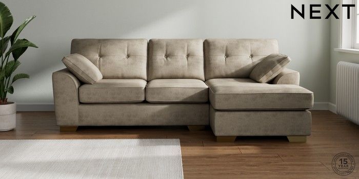 7.3.1 Buy Stamford Buttoned Back Medium Sofa Chaise - Right Hand Monza Faux Leather Easy Clean Mink Brown Large Square Angle - Brushed Brass from the Next UK online shop Click here to use our accessible website