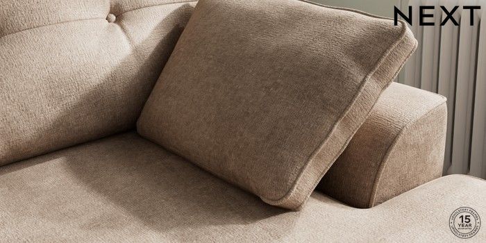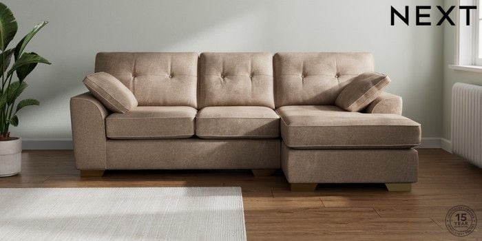 7.2.10 Buy Stamford Buttoned Back Medium Sofa Chaise - Right Hand Plush Chenille Mid Natural Large Square Angle - Brushed Brass from the Next UK online shop Click here to use our accessible website