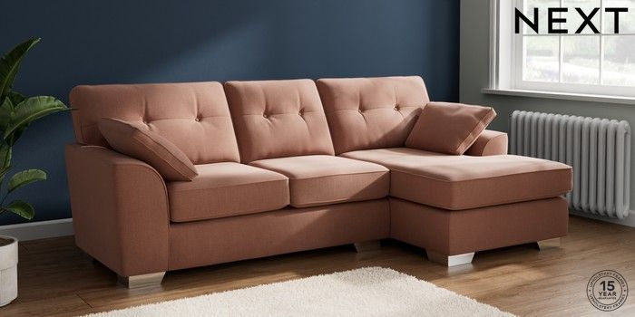 6.12.1 Buy Stamford Buttoned Back Medium Sofa Chaise - Right Hand Relaxed Linen Look Light Rust Brown Large Square Angle - Chrome Metal from the Next UK online shop Click here to use our accessible website