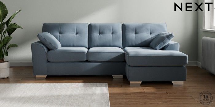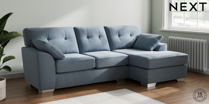 7.2.10 Buy Stamford Buttoned Back Medium Sofa Chaise - Right Hand Relaxed Linen Look Mid Blue Large Square Angle - Chrome Metal from the Next UK online shop Click here to use our accessible website
