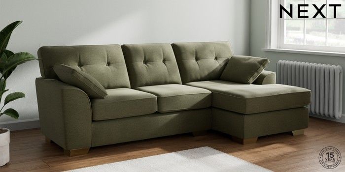 7.2.10 Buy Stamford Buttoned Back Medium Sofa Chaise - Right Hand Ripple Chenille Mid Moss Green Large Square Angle - Brushed Brass from the Next UK online shop Click here to use our accessible website