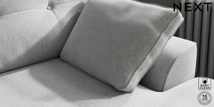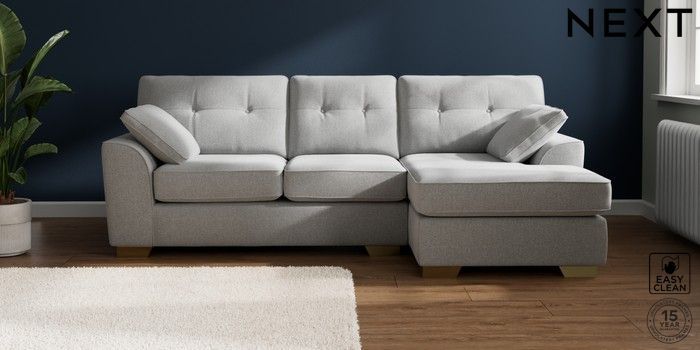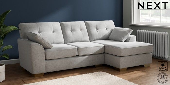 7.2.10 Buy Stamford Buttoned Back Medium Sofa Chaise - Right Hand Tweedy Blend Easy Clean Light Silver Grey Large Square Angle - Brushed Brass from the Next UK online shop Click here to use our accessible website