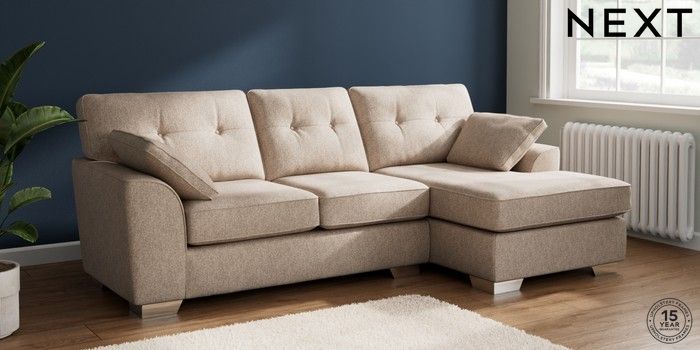 7.2.10 Buy Stamford Buttoned Back Medium Sofa Chaise - Right Hand Tweedy Chenille Mid Natural Large Square Angle - Chrome Metal from the Next UK online shop Click here to use our accessible website