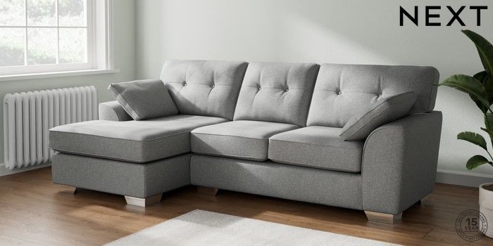 7.2.6 Buy Stamford Buttoned Back Medium Sofa Chaise - Left Hand Chunky Weave Mid Grey Large Square Angle - Chrome Metal from the Next UK online shop Click here to use our accessible website
