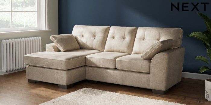7.2.6 Buy Stamford Buttoned Back Small Sofa Chaise - Left Hand Plush Chenille Light Natural Large Square Angle - Gunmetal from the Next UK online shop Click here to use our accessible website
