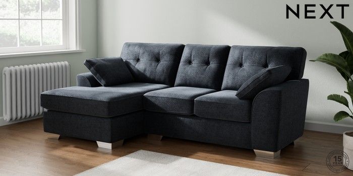 6.12.1 Buy Stamford Buttoned Back Small Sofa Chaise - Left Hand Boucle Chenille Dark Slate Blue Large Square Angle - Chrome Metal from the Next UK online shop Click here to use our accessible website