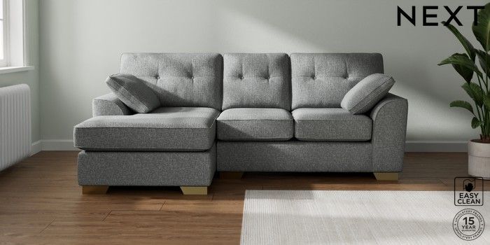 7.2.10 Buy Stamford Buttoned Back Small Sofa Chaise - Left Hand Chunky Boucle Easy Clean Mid Grey Large Square Angle - Brushed Brass from the Next UK online shop Click here to use our accessible website