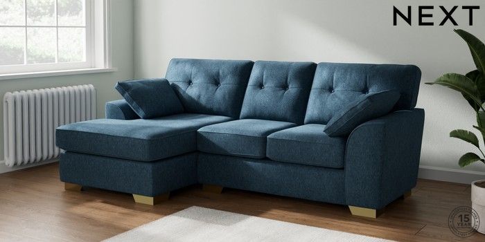 7.2.10 Buy Stamford Buttoned Back Small Sofa Chaise - Left Hand Cotswold Chenille Dark Blue Large Square Angle - Brushed Brass from the Next UK online shop Click here to use our accessible website