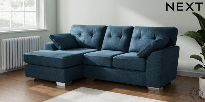 7.2.10 Buy Stamford Buttoned Back Small Sofa Chaise - Left Hand Cotswold Chenille Dark Blue Large Square Angle - Chrome Metal from the Next UK online shop Click here to use our accessible website