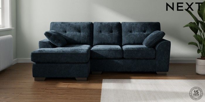 7.2.10 Buy Stamford Buttoned Back Small Sofa Chaise - Left Hand Distressed Velour Midnight Blue Large Square Angle - Gunmetal from the Next UK online shop Click here to use our accessible website