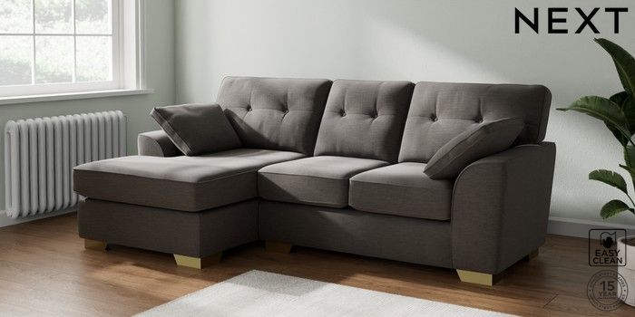 6.12.1 Buy Stamford Buttoned Back Small Sofa Chaise - Left Hand Fine Chenille Easy Clean Dark Smoke Grey Large Square Angle - Brushed Brass from the Next UK online shop Click here to use our accessible website