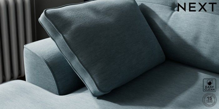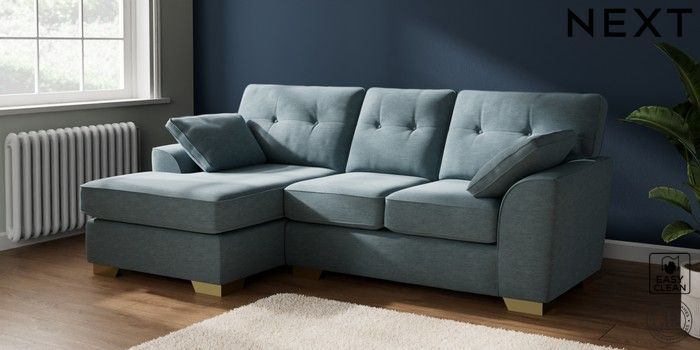 7.2.10 Buy Stamford Buttoned Back Small Sofa Chaise - Left Hand Fine Chenille Easy Clean Mid Blue Large Square Angle - Brushed Brass from the Next UK online shop Click here to use our accessible website