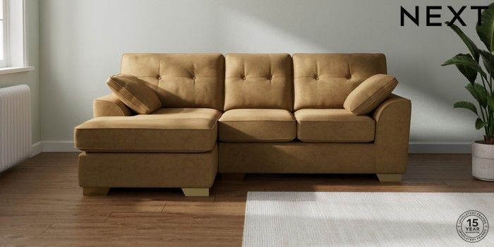 7.2.6 Buy Stamford Buttoned Back Small Sofa Chaise - Left Hand Luxe Chenille Honey Yellow Large Square Angle - Brushed Brass from the Next UK online shop Click here to use our accessible website