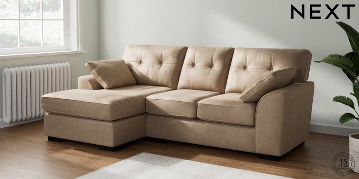 7.2.10 Buy Stamford Buttoned Back Small Sofa Chaise - Left Hand Luxe Chenille Mid Camel Beige Large Square Angle - Dark from the Next UK online shop Click here to use our accessible website