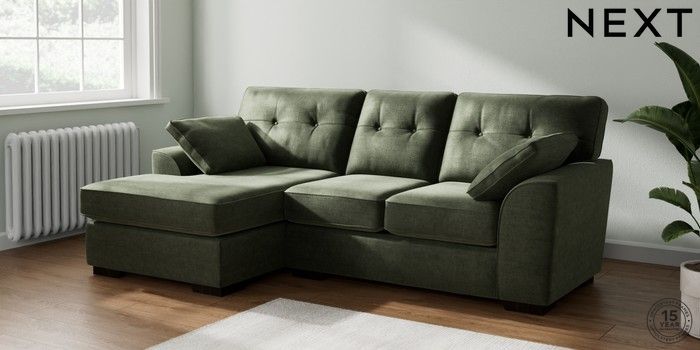 7.2.10 Buy Stamford Buttoned Back Small Sofa Chaise - Left Hand Luxe Chenille Mid Green Large Square Angle - Dark from the Next UK online shop Click here to use our accessible website