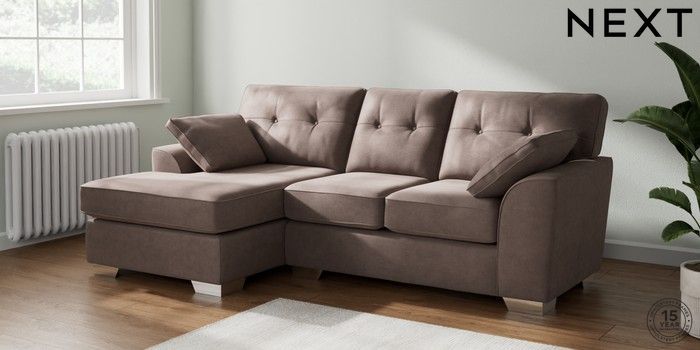 6.12.1 Buy Stamford Buttoned Back Small Sofa Chaise - Left Hand Luxe Chenille Mink Brown Large Square Angle - Chrome Metal from the Next UK online shop Click here to use our accessible website