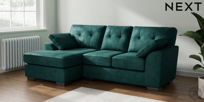 7.2.10 Buy Stamford Buttoned Back Small Sofa Chaise - Left Hand Plush Chenille Dark Teal Green Large Square Angle - Gunmetal from the Next UK online shop Click here to use our accessible website