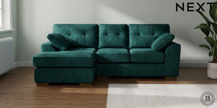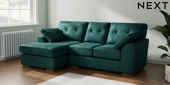 7.2.10 Buy Stamford Buttoned Back Small Sofa Chaise - Left Hand Plush Chenille Dark Teal Green Large Square Angle - Mid from the Next UK online shop Click here to use our accessible website
