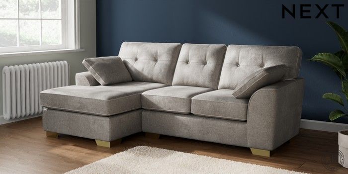 6.12.1 Buy Stamford Buttoned Back Small Sofa Chaise - Left Hand Plush Chenille Light Grey Large Square Angle - Brushed Brass from the Next UK online shop Click here to use our accessible website
