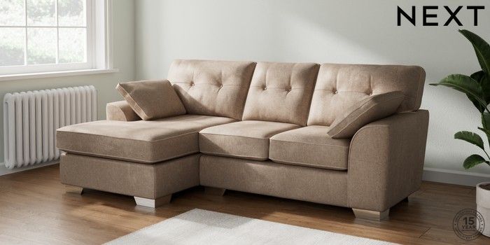 6.12.1 Buy Stamford Buttoned Back Small Sofa Chaise - Left Hand Plush Chenille Mid Natural Large Square Angle - Chrome Metal from the Next UK online shop Click here to use our accessible website