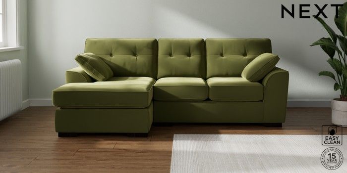 7.2.10 Buy Stamford Buttoned Back Small Sofa Chaise - Left Hand Plush Velvet Easy Clean Mid Olive Green Large Square Angle - Dark from the Next UK online shop Click here to use our accessible website