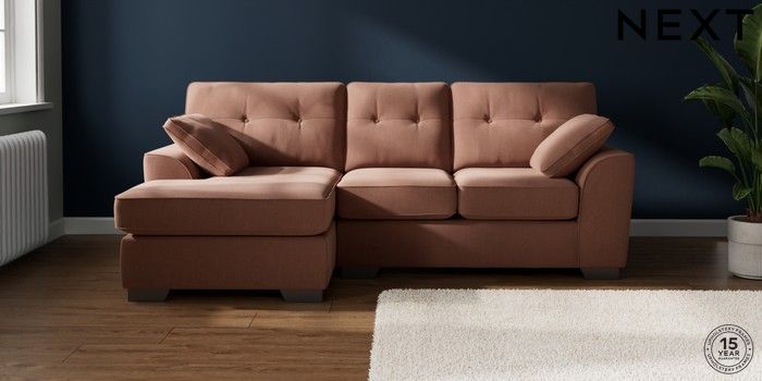 7.2.10 Buy Stamford Buttoned Back Small Sofa Chaise - Left Hand Relaxed Linen Look Light Rust Brown Large Square Angle - Gunmetal from the Next UK online shop Click here to use our accessible website