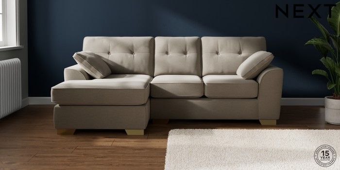 7.2.10 Buy Stamford Buttoned Back Small Sofa Chaise - Left Hand Ripple Chenille Light Natural Large Square Angle - Brushed Brass from the Next UK online shop Click here to use our accessible website