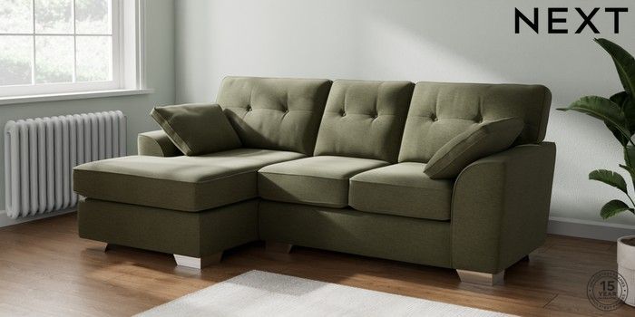 7.2.10 Buy Stamford Buttoned Back Small Sofa Chaise - Left Hand Ripple Chenille Mid Moss Green Large Square Angle - Chrome Metal from the Next UK online shop Click here to use our accessible website