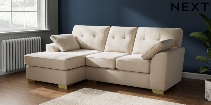 7.2.10 Buy Stamford Buttoned Back Small Sofa Chaise - Left Hand Studio Chenille Oyster Large Square Angle - Brushed Brass from the Next UK online shop Click here to use our accessible website