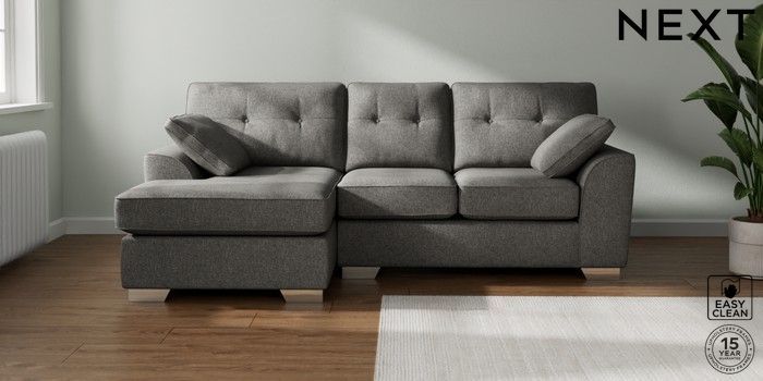 7.2.10 Buy Stamford Buttoned Back Small Sofa Chaise - Left Hand Tweedy Blend Easy Clean Dark Grey Large Square Angle - Chrome Metal from the Next UK online shop Click here to use our accessible website