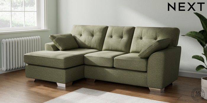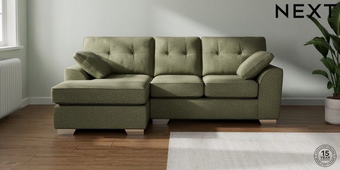 7.2.10 Buy Stamford Buttoned Back Small Sofa Chaise - Left Hand Tweedy Chenille Mid Moss Green Large Square Angle - Chrome Metal from the Next UK online shop Click here to use our accessible website