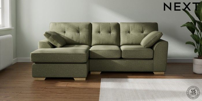 7.2.10 Buy Stamford Buttoned Back Small Sofa Chaise - Left Hand Tweedy Chenille Mid Moss Green Large Square Angle - Light from the Next UK online shop Click here to use our accessible website