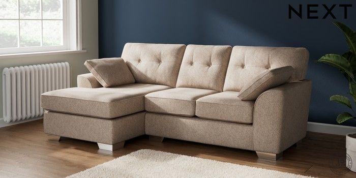 7.2.10 Buy Stamford Buttoned Back Small Sofa Chaise - Left Hand Tweedy Chenille Mid Natural Large Square Angle - Chrome Metal from the Next UK online shop Click here to use our accessible website