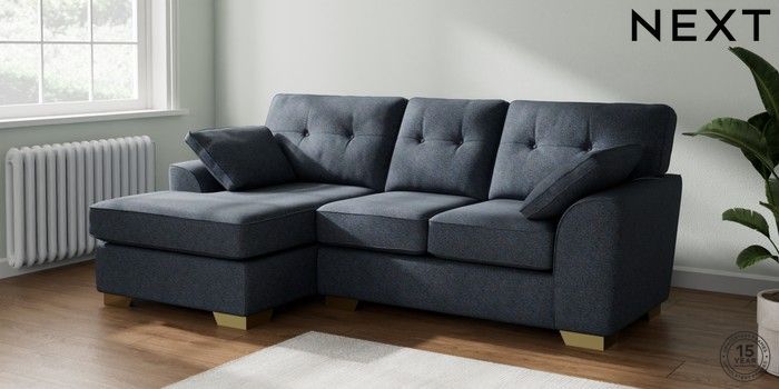 7.2.10 Buy Stamford Buttoned Back Small Sofa Chaise - Left Hand Tweedy Chenille Navy Blue Large Square Angle - Brushed Brass from the Next UK online shop Click here to use our accessible website