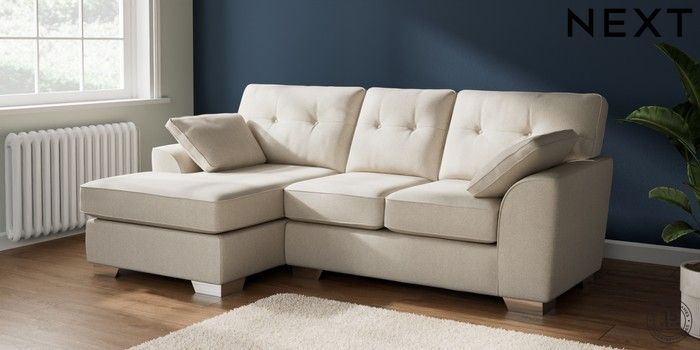 7.2.10 Buy Stamford Buttoned Back Small Sofa Chaise - Left Hand Tweedy Chenille Oyster Large Square Angle - Chrome Metal from the Next UK online shop Click here to use our accessible website