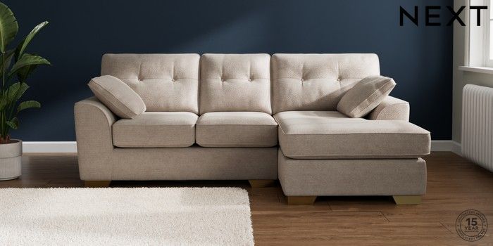 7.2.10 Buy Stamford Buttoned Back Small Sofa Chaise - Right Hand Boucle Chenille Light Natural Large Square Angle - Brushed Brass from the Next UK online shop Click here to use our accessible website